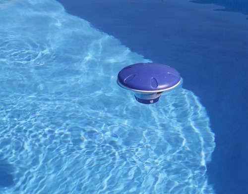 Dispenser för desinfektionstabletter med barnlås. Flyter ovanpå vattenytan och avger långsamt vattenvårdande medel till poolvattnet.