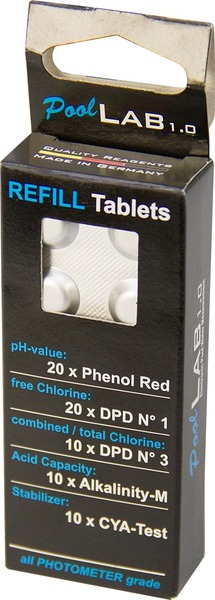 Refill Pack för Pool Lab. Innehåller 20 DPD nr. 1 fotometer - 10 DPD nr. 3 fotometer - 20 fenolröd fotometer - 10 Alka- M-fotometer - 10 CyA-TEST